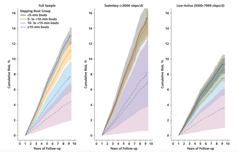 - Peserta yang mengambil sebahagian besar langkah mereka dalam sesi 10–15 minit mempunyai kira-kira 4% risiko mengalami masalah kardiovaskular (seperti serangan jantung atau strok) dalam tempoh 10 tahun berikutnya.